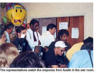 If the group hadn’t bonded sufficiently simply by boarding the buses, once again the Republicans inadvertently aided their cause. Back in Austin, they were vilified, called names like “chicken” and “coward.” Long after the DPS and reporters found them on Monday, their families were followed and questioned by police ostensibly searching for them. These tactics simply drew them closer together. “When they started calling us names, it showed a lack of character and a lack of leadership,” said a visibly angry Senfronia Thompson, sitting on a couch outside the war room.